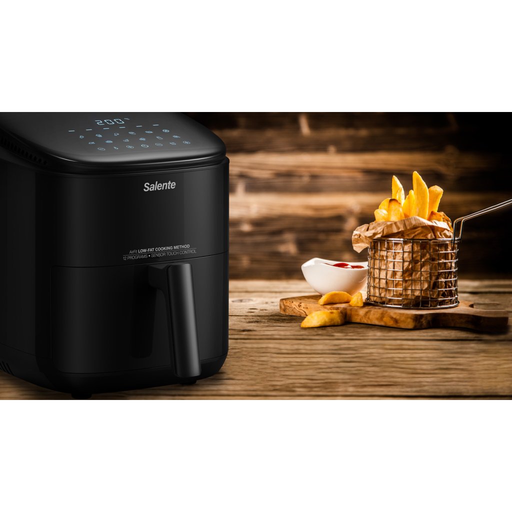 The Salente AirFit air fryer meets today's highest demands for healthy and fast food preparation, offering a combination of several cooking methods from frying and grilling to drying and defrosting. It allows even the most demanding cooks and chefs to set the temperature in the range of 30-200 °C in 5 °C increments and to set the cooking time in the range of 1-60 minutes in 1 minute increments.