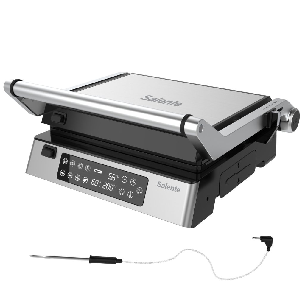 Along with the grill is supplied an external temperature probe, whose needle is simply stuck into the meat and the display immediately shows the immediate temperature of the meat. The touch control panel lets you set the desired target temperature and the grill alerts you with an acoustic signal when it is reached. The temperature rise of the probe can be conveniently monitored on the display throughout the grilling process, giving you perfect control over the doneness of your meat. The target temperature can be changed freely even during grilling without removing the needle from the meat. The target temperature can be set from 45 to 90 °C in 1 °C steps. The storage box for the probe and its cable is very handy. Thanks to the magnetic attachment, the whole box is effectively hidden in the grill body on the side of the grill - so you always have the probe at hand and cannot lose it.