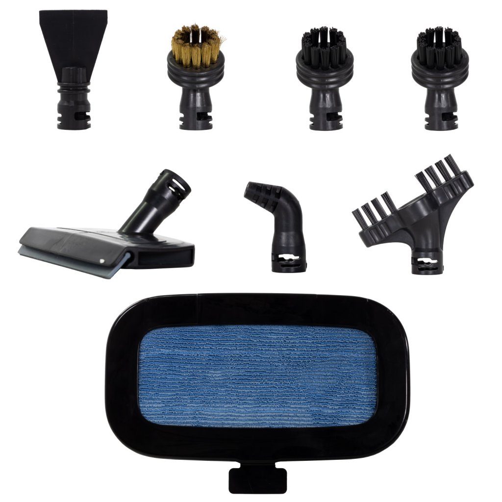 The steam mop includes a wide range of accessories for various types of cleaning.