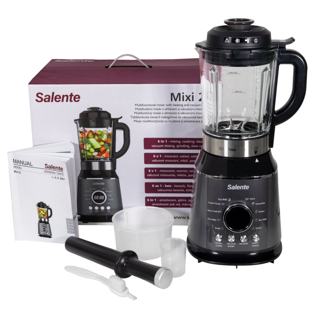 The Salente Mixi 2L is a multifunctional, high-speed blender, which offers blending as well as cooking, steaming, slow cooking and vacuum blending functions. You can use it to make roast tenderloin of beef, soup, chick pea mash, jams, and soy milk. The blender has 10 automatic programmes: soy milk, cream soup (no blending), slow cooking at 85°C, puree, traditional soup (no blending), baby food/juice, smoothie, cocktails, nut milk, and the blending programme (no cooking).