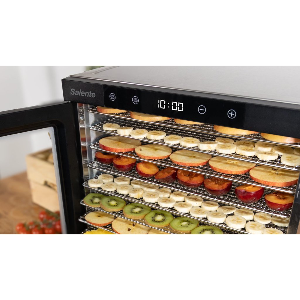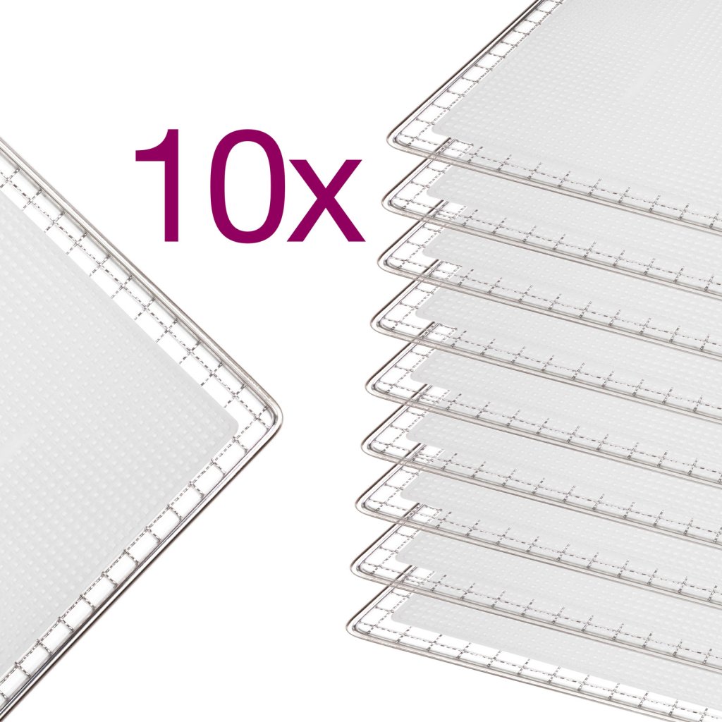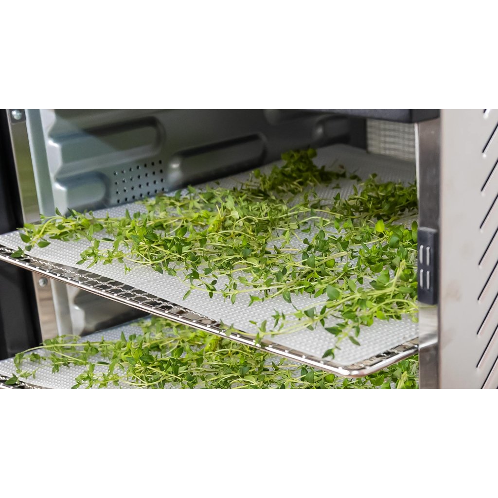 - 10 tray liners with fine mesh for drying more delicate and sticky ingredients (e.g. mushrooms, herbs, bananas, tomatoes, etc.)