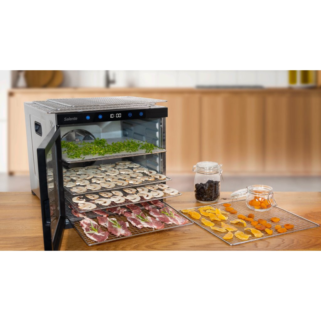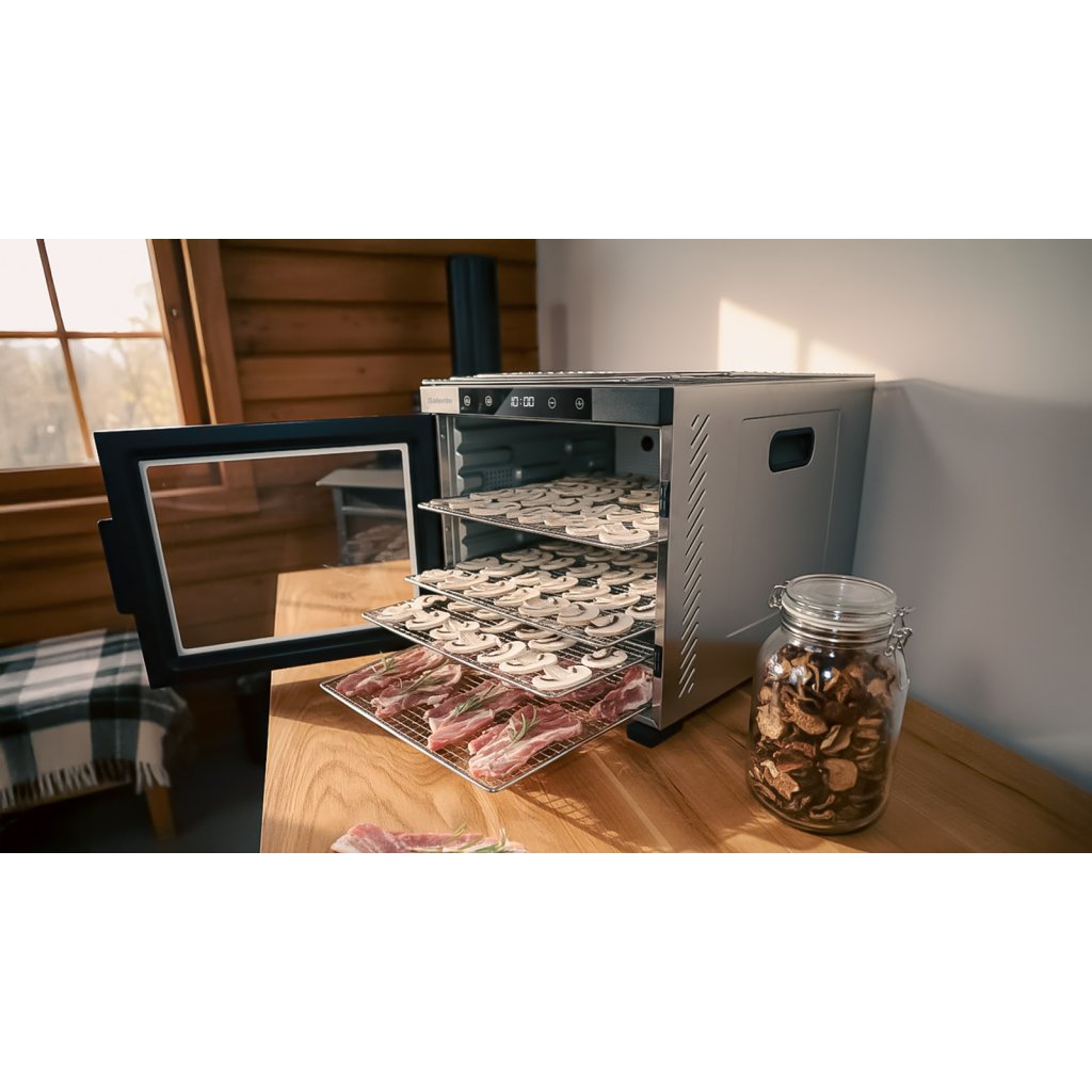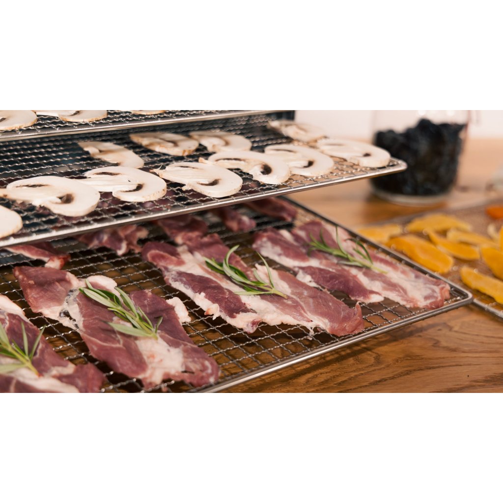 In addition, this model features a set of ten drying plates with fine mesh for drying finer and sticky ingredients (e.g. mushrooms, herbs, bananas, tomatoes, etc.). It also comes with a drip tray on the bottom of the dryer to catch excess juices from some ingredients, making cleaning the stainless steel interior of the dryer much easier. Both the plate and the tray have dimensions 39,4 × 38 cm.