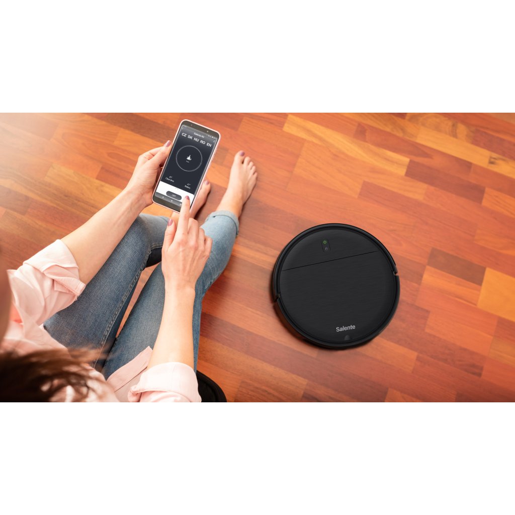 Your Salente R2 robotic vacuum cleaner can be controlled via your mobile app in English. The app makes the vacuum cleaner easy to use, while reporting its current condition or battery status. You vacuum cleaner supports voice control technology, so you can use voice commands to control it.