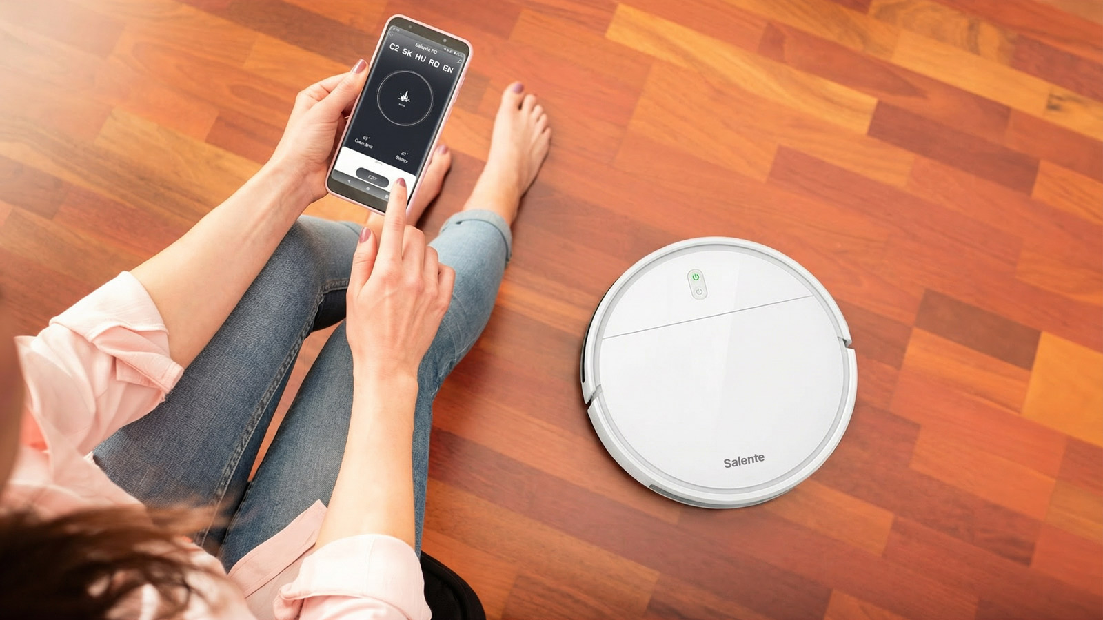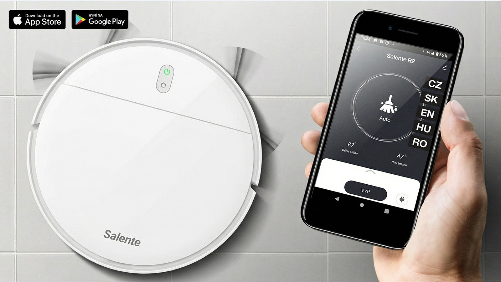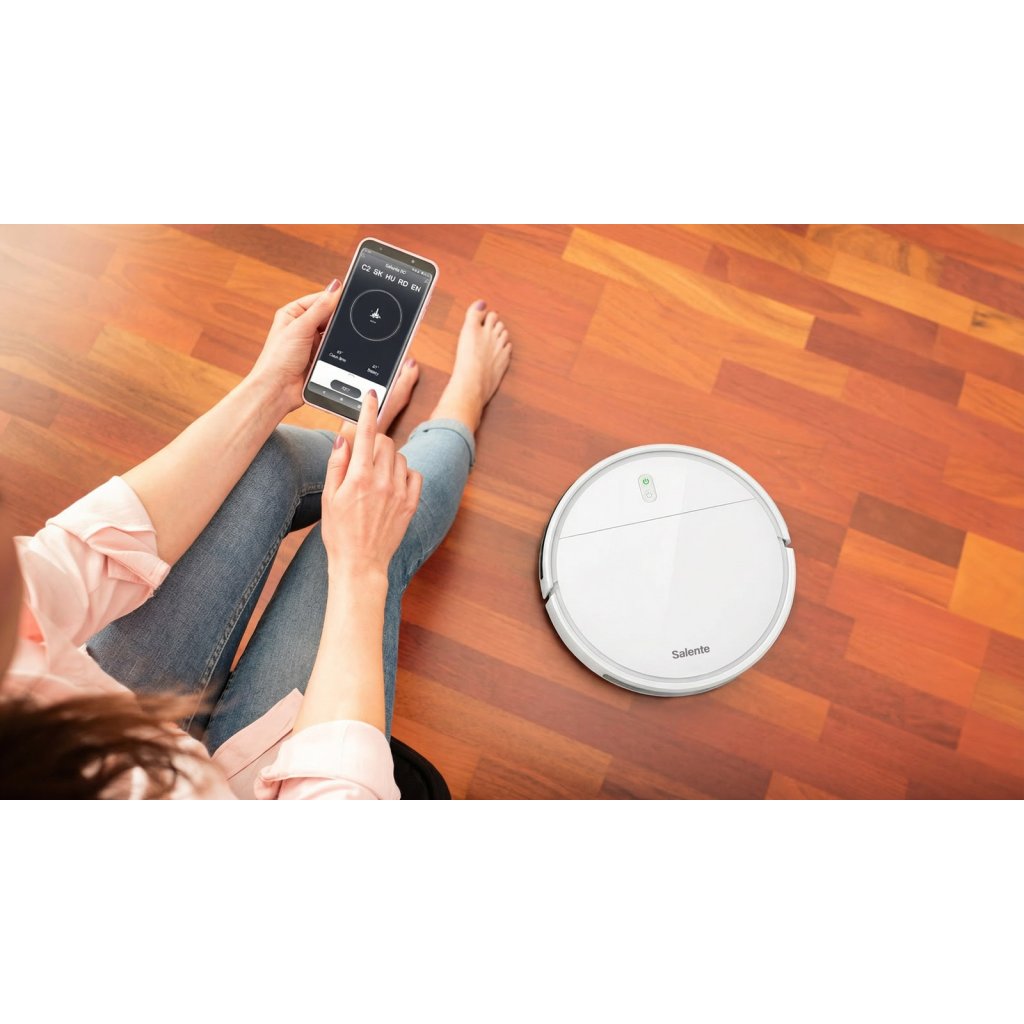 Your Salente R2 robotic vacuum cleaner can be controlled via your mobile app in English. The app makes the vacuum cleaner easy to use, while reporting its current condition or battery status. You vacuum cleaner supports voice control technology, so you can use voice commands to control it.