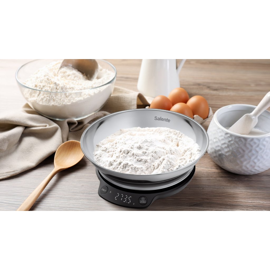 The Salente Rimare kitchen scale will impress you with its elegant design that looks great and at the same time ensures easy maintenance. You can easily weigh ingredients directly in the removable stainless-steel bowl with a capacity of 1 l, or you can use the stainless-steel weighing surface itself or place your own container or plate on the scale.